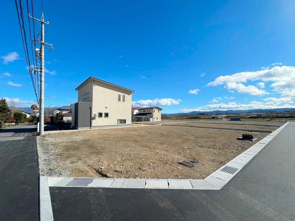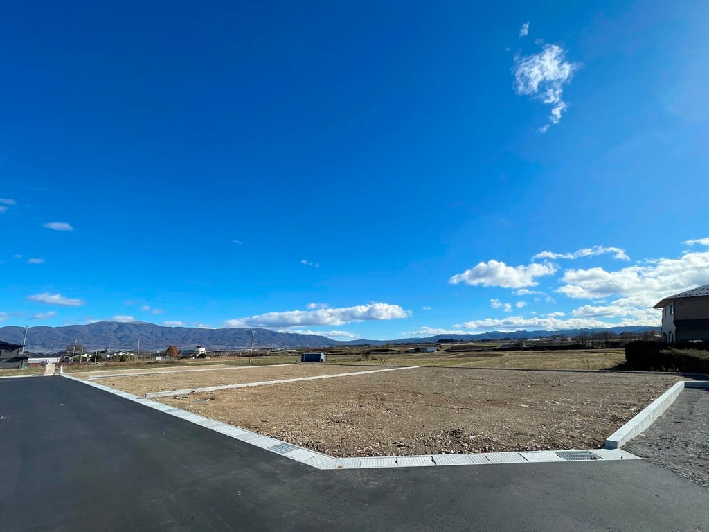 アイシティ21と山形村役場の中間点に誕生する、全18区画の分譲地。南側が開けて明るい立地です。2026年1月末に土地引き渡し予定、建築条件はありません。